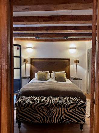 Exposed wooden beams continue here, adding warmth and a sense of history. The simple bedside tables and minimalist lamps let the textures and patterns shine without feeling cluttered.